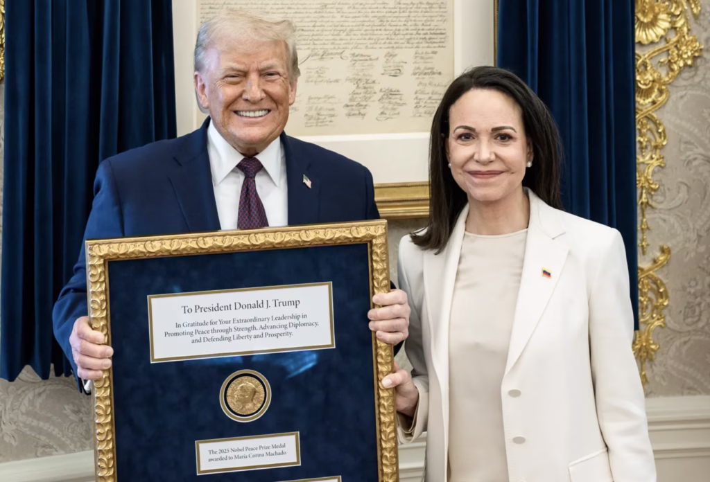 No Peace Prize, No Peace – Norway did not deny President Trump the Nobel Peace Prize he so much covets. Rather, it was the Nobel Committee based in Copenhagen, that instead awarded its Peace Prize to Venezuela opposition leader Marina Corina Machado – who handed her medal over to the US president at the White House last week (pictured above) in exchange for a DJT gift bag. Perhaps most important to Trump, 17 years ago the Nobel Committee handed its Peace Prize to President Obama.